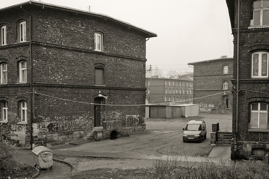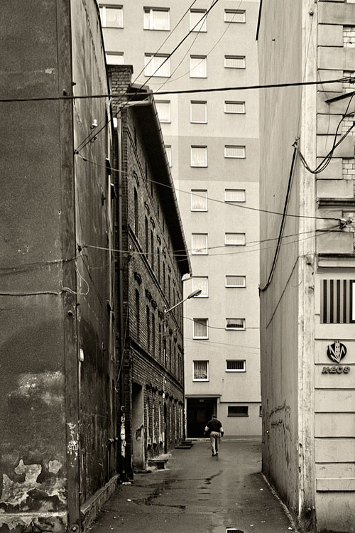 …właśnie tu jest problem: ukryte piękno tych miejsc doświadczone niejednokrotnie podczas zabaw lat szczenięcych, jest wypierane ze świadomości. Mają nam w tym pomóc już to nabyte uprzedzenia, już to stanowiące barierę dla oczu ( i obiektywu) kolejne nawarstwienia zabudowy: przecinające dawne organizmy miejskie drogi, lustrzane fasady biurowców, tafle bannerów reklamowych.