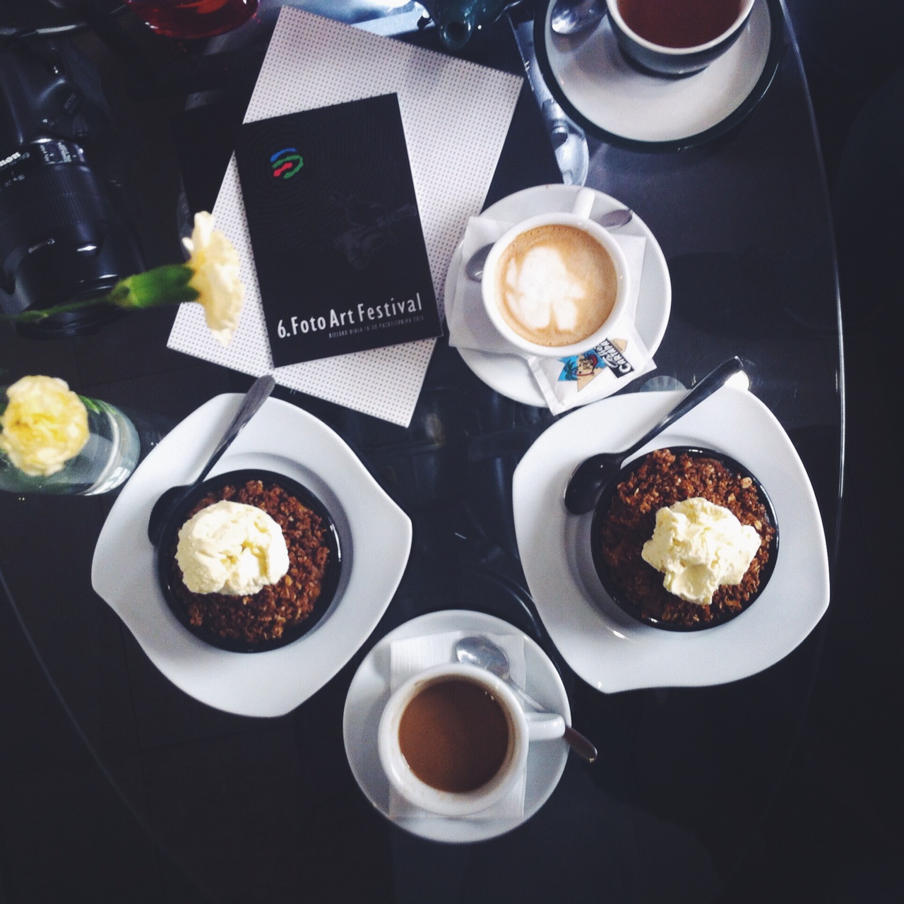 Kierunek Bielsko-Biała i 6. FotoArtFestival. Koleje Śląskie nas pospiesznie wiozły a my starałyśmy się uszczęśliwić pasażerów rozmowami o obiektywach, krzywych kadrach, trójkątach i przyszłych plenerach. Po dotarciu na miejsce obranym kierunkiem pierwej była kawa. I gdyby nie fakt, ze to Fotofestival był naszym celem to mogłybyśmy w kawiarni pozostać do wieczora, znokautowane obłędnym crumble z lodami.